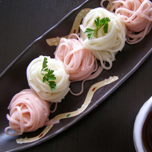 「つるっ」とした食感と、華やかな彩りは、大切なお客様やお祝いの席でのもてなし麺にオススメ。